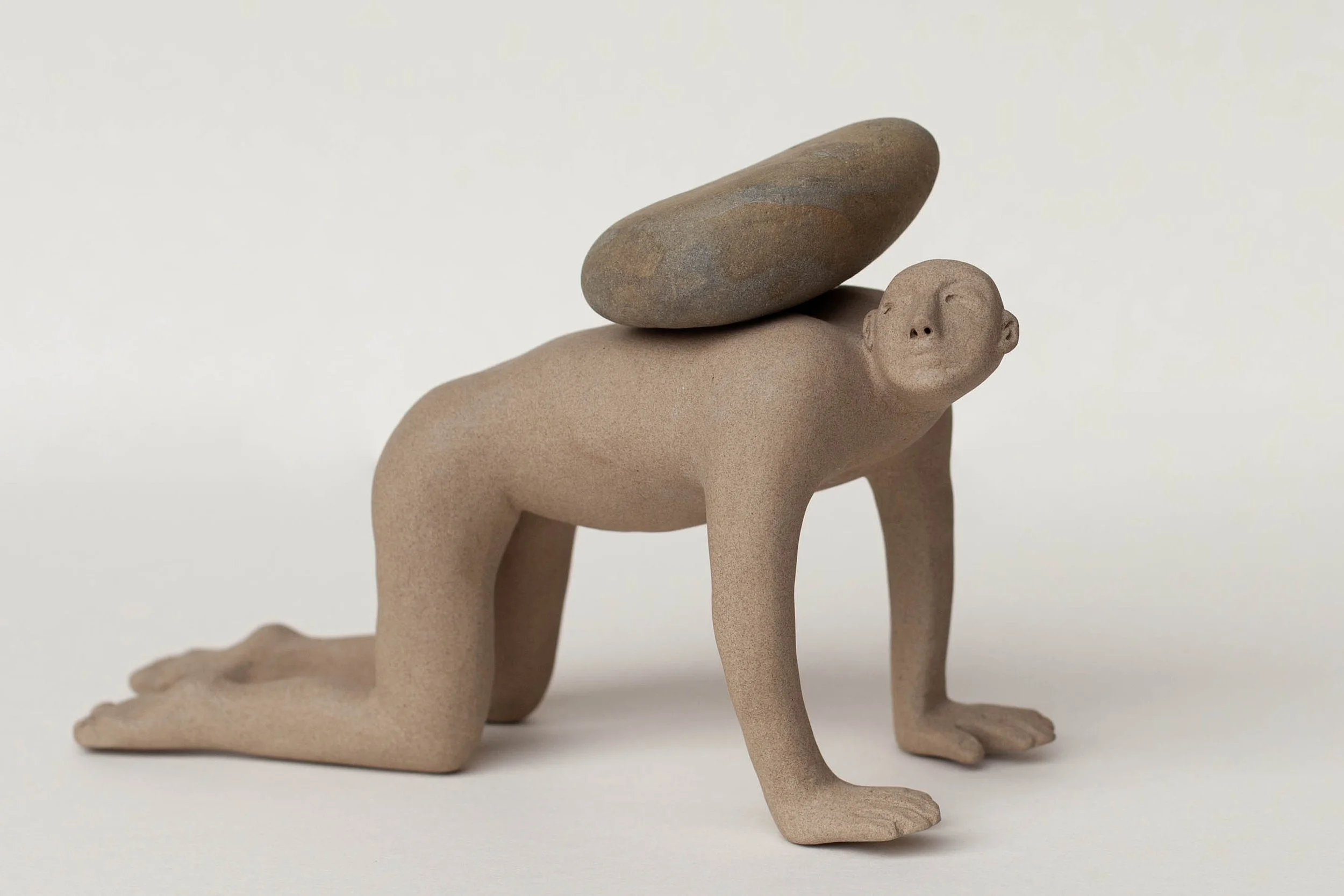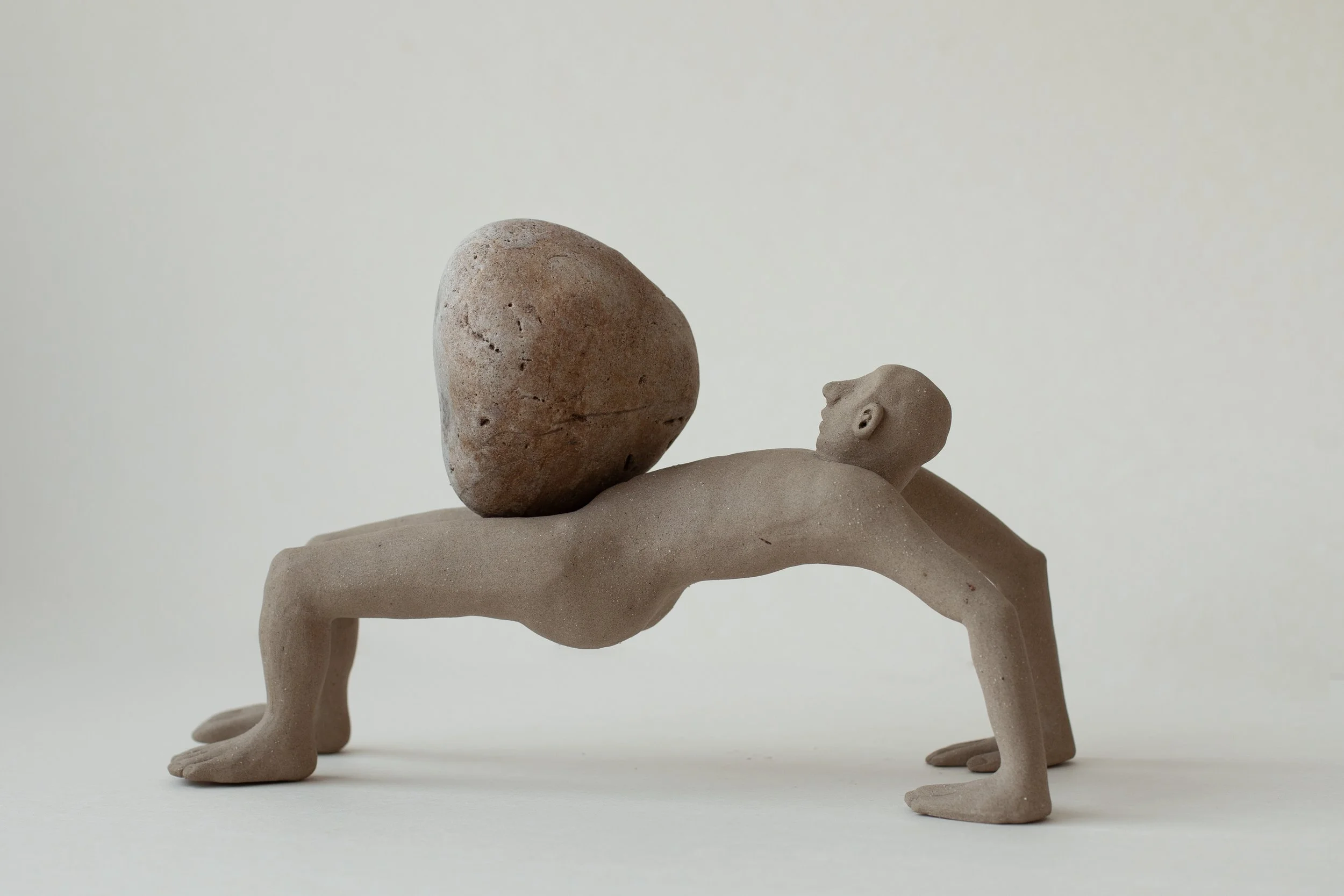 In these sculptures, ceramics and stone symbolize the human being and their burden. The stone represents a frozen emotion that the body is forced to carry. It becomes part of the body itself — almost invisible, yet constantly felt.
